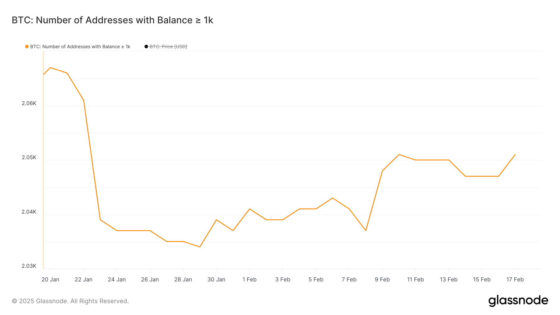 Ang bilang ng Bitcoin whales – mga address na may hawak na higit sa 1,000 BTC – ay tumaas sa 2,051, mula sa 2,037 sampung araw na ang nakalipas. Ang pagsubaybay sa mga malalaking holder na ito ay mahalaga dahil ang kanilang accumulation o distribution ay maaaring magpahiwatig ng potensyal na pagbabago sa market sentiment.