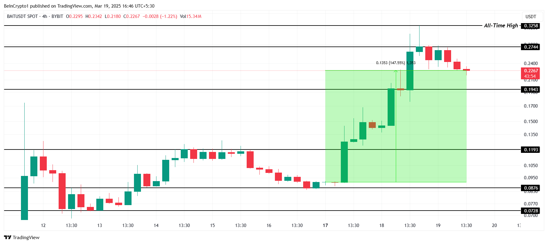 Nakita ng Bubblemaps ang makabuluhang 147% na pagtaas ng presyo sa nakaraang 48 oras. Pero, pagkatapos ng kamakailang 17% na pagbaba, ang presyo ay nasa $0.226 na ngayon. Dahil sa kasalukuyang kondisyon ng merkado, ang BMT ay maaaring makaranas ng karagdagang pagbaba, posibleng bumagsak sa $0.194 o kahit sa $0.119 kung patuloy na bumaba ang sentiment ng mga investor.