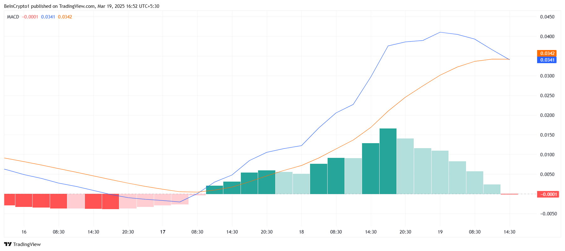 Ipinapakita rin ng Moving Average Convergence Divergence (MACD) indicator ang paghina ng momentum. Matapos magpakita ng positibong signals noong una sa rally, ang MACD ay nag-shift patungo sa bearish crossover, na nagsa-suggest ng paglipat mula sa positibo patungo sa negatibong momentum.