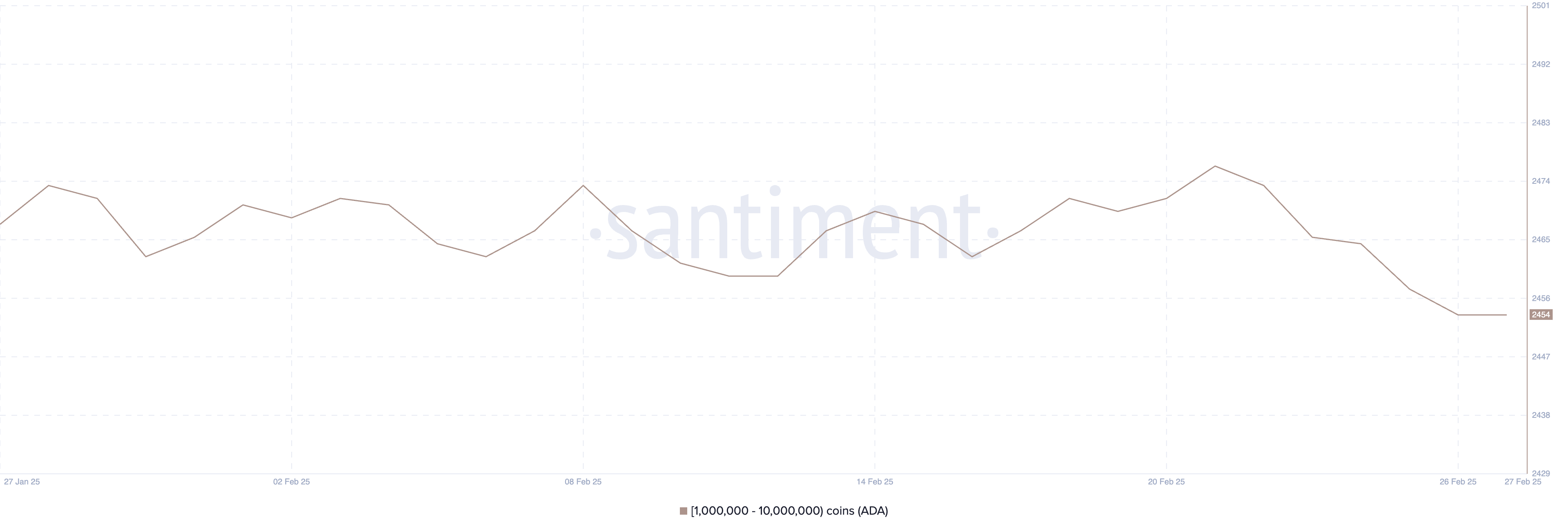 Ang bilang ng Cardano whales – mga address na may hawak na nasa pagitan ng 1 milyon at 10 milyon ADA – ay patuloy na bumababa sa nakaraang linggo, mula 2,477 noong Pebrero 21 hanggang 2,454 sa kasalukuyan. Ito ang pinakamababang level mula Enero 9.