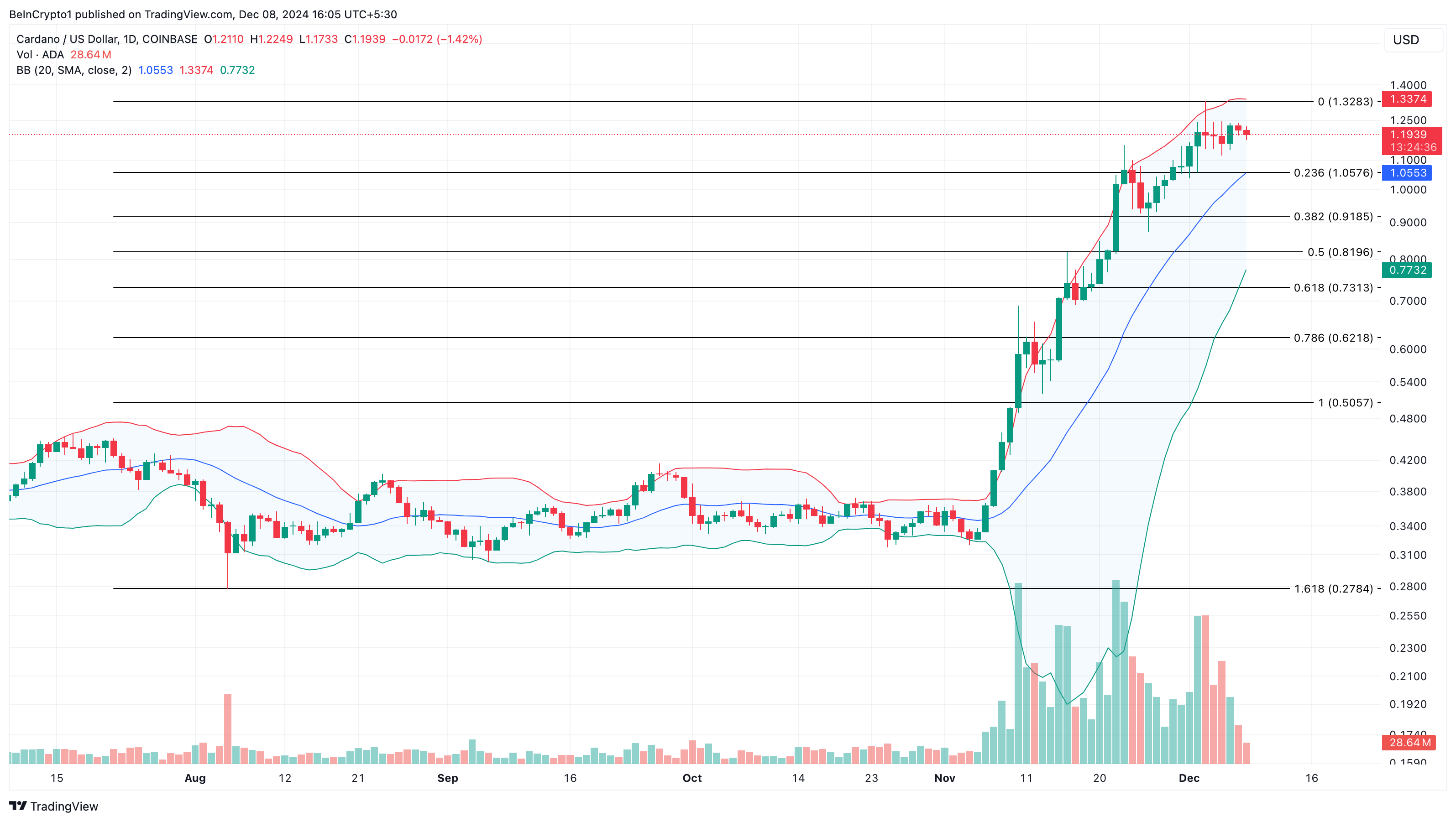 Sa technical perspective, ipinapakita ng daily chart na lumawak ang Bollinger Bands (BB). Ang expansion na ito ay nagpapakita ng mataas na volatility sa ADA, na nagsasabing malaki ang posibilidad ng price swings sa mga susunod na araw.