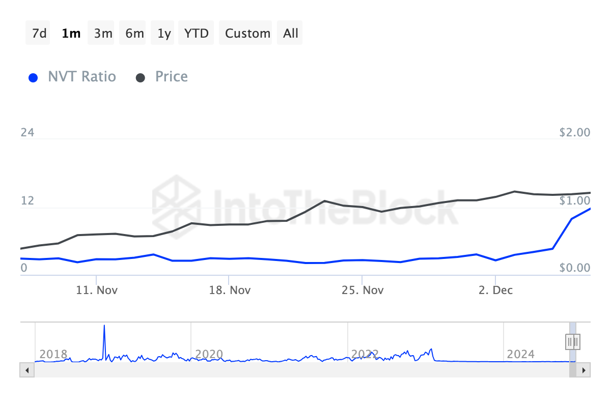 Maliban dito, ipinapakita ng IntoTheBlock data na tumaas ang Network Value to Transaction (NVT) ratio. Ang NVT ratio ay ginagamit para i-assess ang valuation ng cryptocurrency kumpara sa value na naipapasa sa network.