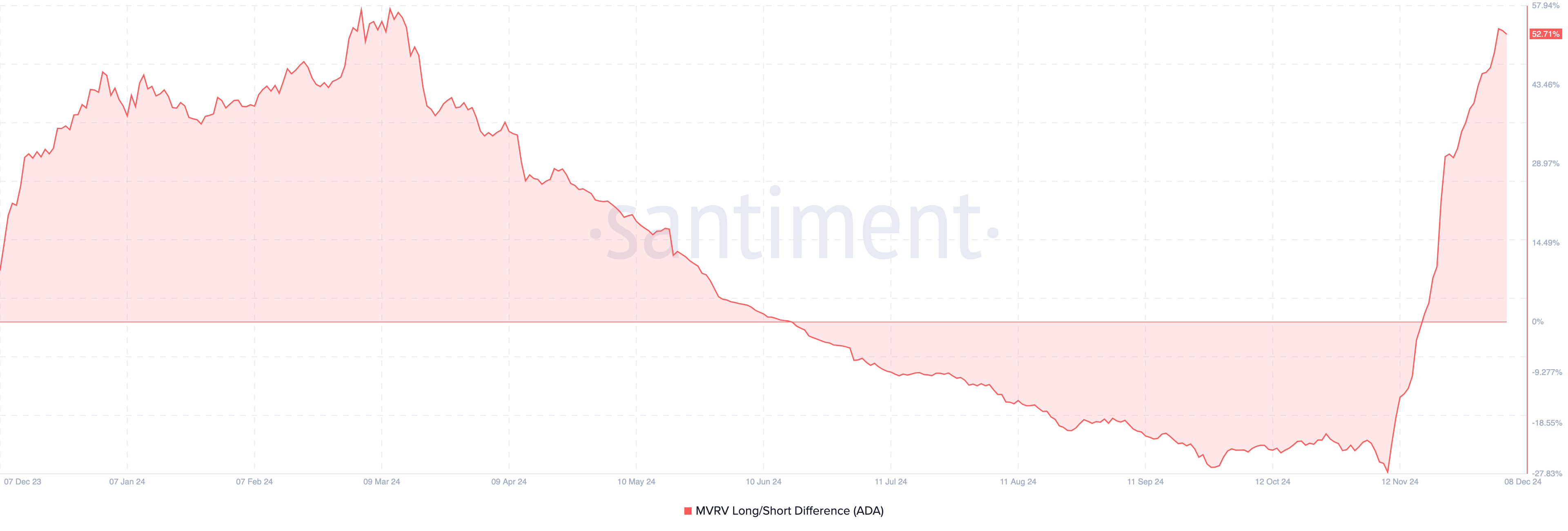 Makikita sa itaas na umabot na sa 52.71% ang reading ng metric, na nagsasabing malapit na ulit maging overvalued ang ADA. Kung totoo ito, baka magkaroon ng notable correction ang presyo ng altcoin.