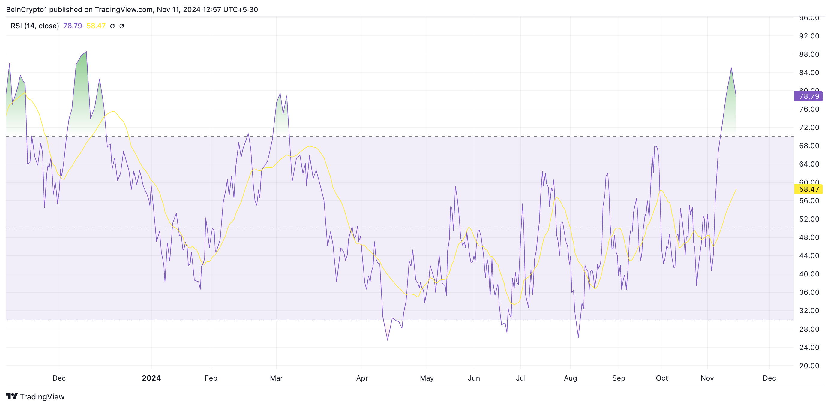 Ang mataas na Relative Strength Index (RSI) ng coin ay isang notable indicator nito. Nasa 78.79 ang RSI ng ADA ngayon, pinakamataas simula noong December 2023.