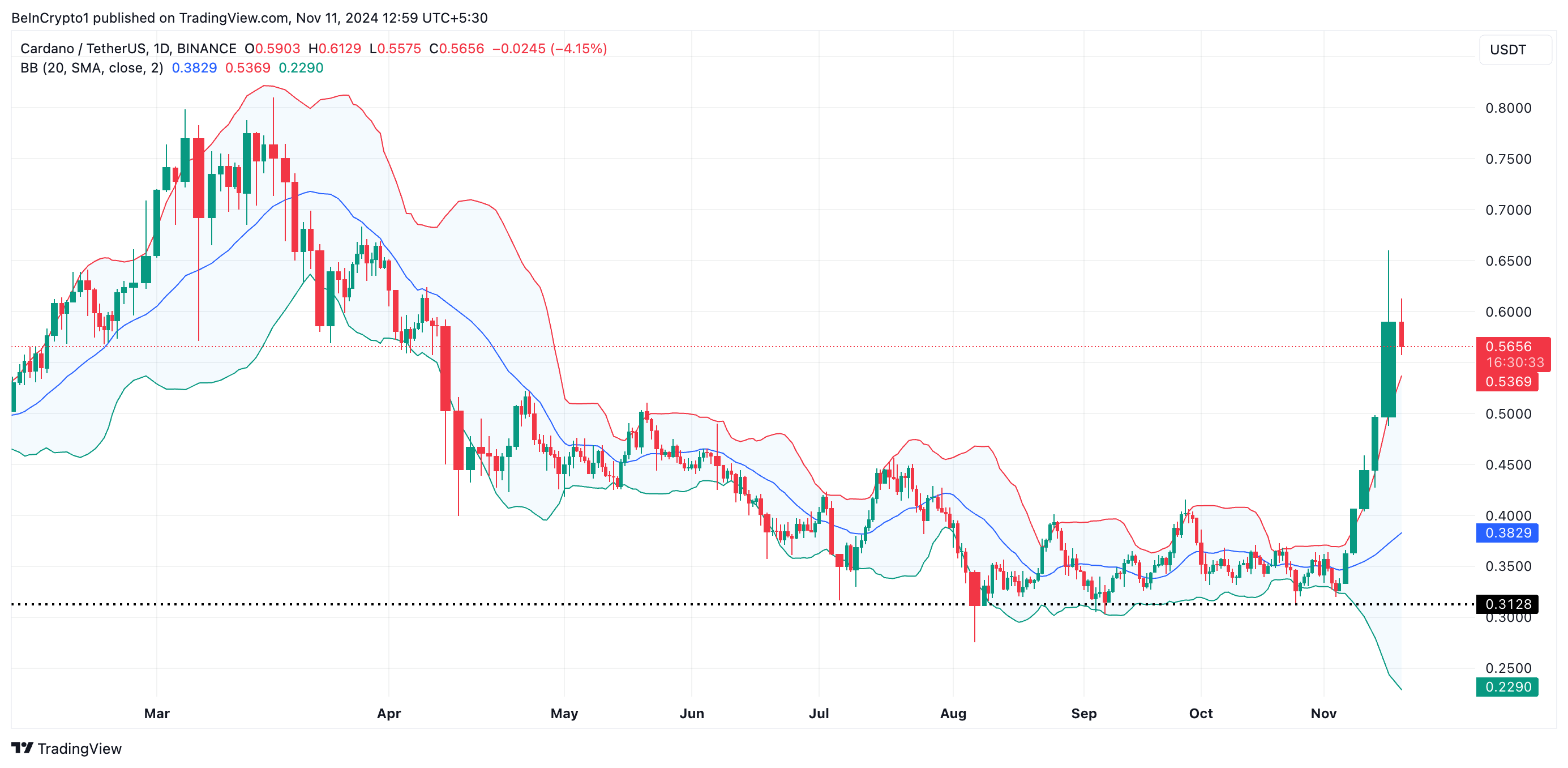 Bukod dito, sa ngayon, nasa itaas ng upper band ng Bollinger Bands indicator ang presyo ng ADA, na nag-confirm ng overbought status nito. Ang Bollinger Bands indicator ay sumusukat sa market volatility at nagbibigay ng potential buy at sell signals. May tatlong main components ito: ang middle band, ang upper band, at ang lower band.