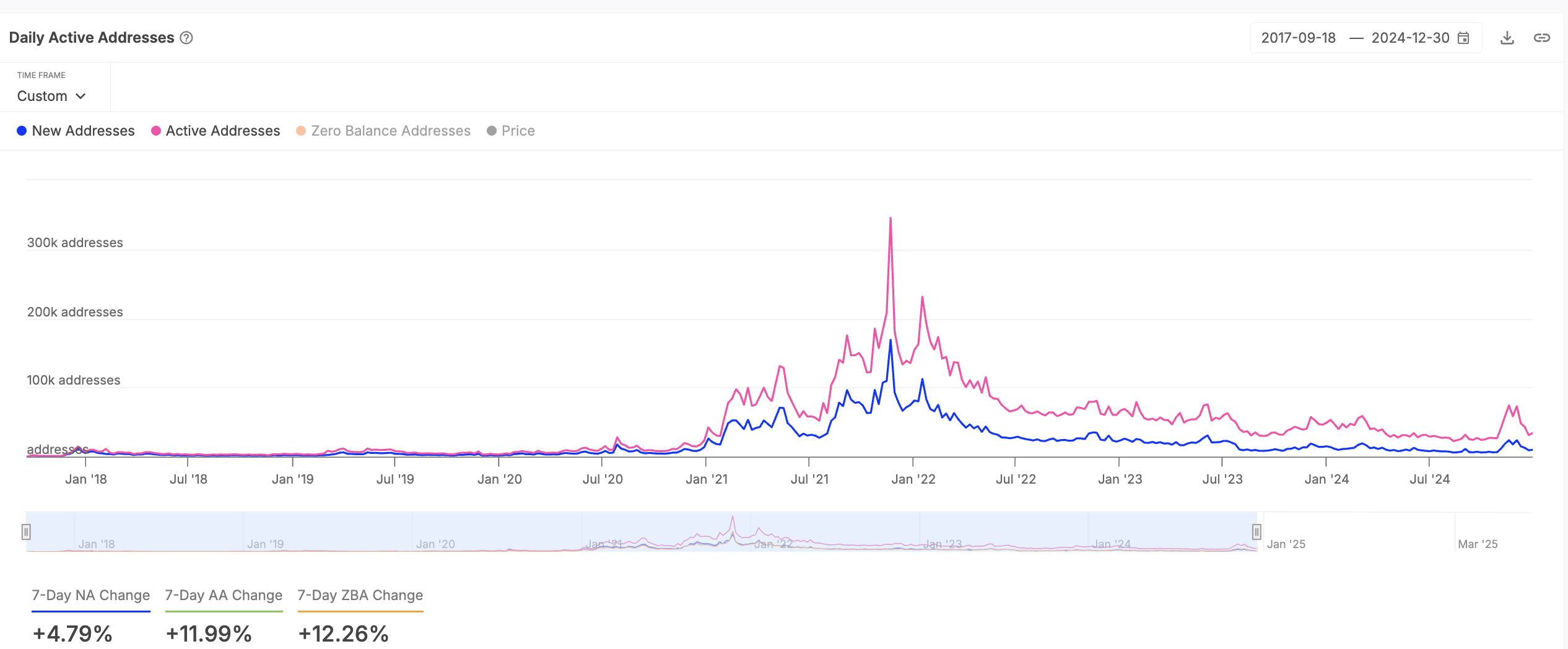 Tumaas ang presyo ng Cardano ng halos 10% nitong nakaraang linggo kasabay ng kasalukuyang pag-recover ng mas malawak na merkado. Ang pagtaas na ito ay dulot ng pagtaas ng aktibidad sa network ng Cardano at mga trend ng long-term holding, na nagpapakita ng lumalaking kumpiyansa ng mga investor.