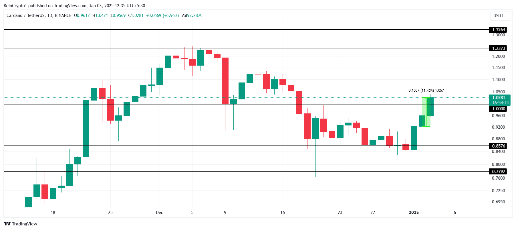 Ang presyo ng Cardano ay tumaas ng 11% sa nakaraang 24 oras, na nagte-trade sa $1.02 sa oras ng pagsulat. Sa pag-break ng $1.00 resistance level, muling nabuhay ang optimismo ng mga investor, na nagpapahiwatig ng potential para sa karagdagang pagtaas. Ang paghawak sa level na ito ay kritikal para sa pagpapanatili ng kumpiyansa sa market.