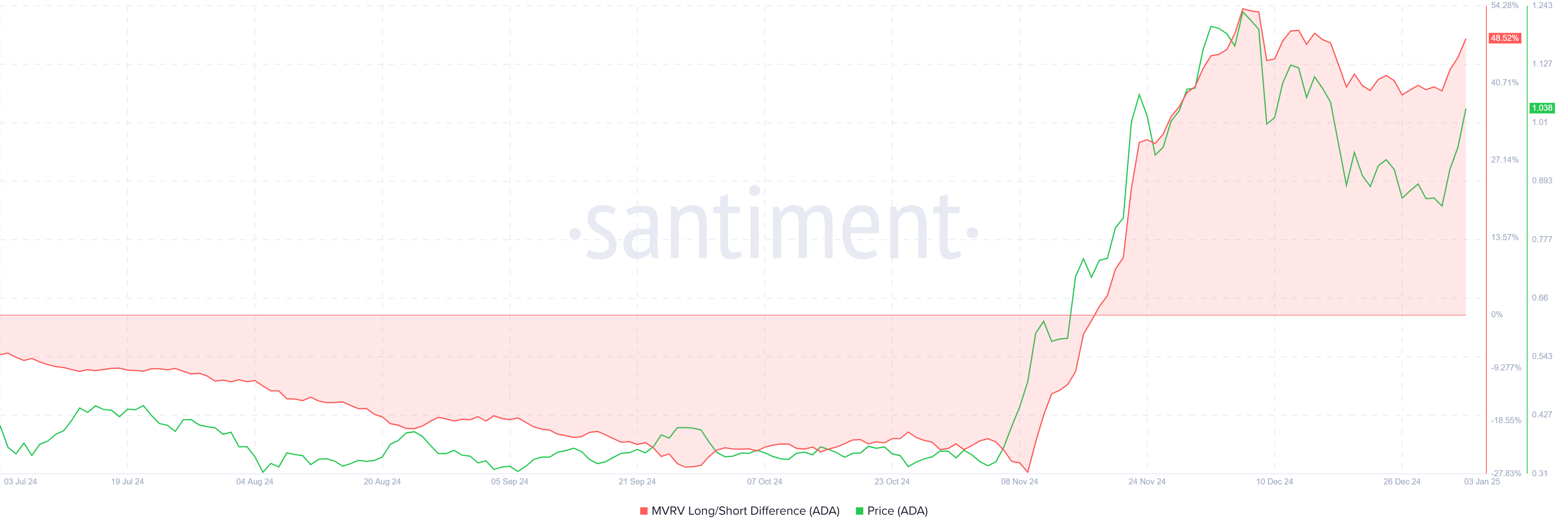 Ipinapakita ng MVRV Long/Short Ratio na ang mga long-term holders ng Cardano ay kasalukuyang kumikita. Kilala bilang backbone ng kahit anong crypto asset, ang HODLing behavior ng grupong ito ay nakakatulong sa pag-iwas sa matinding pagbaba. Ang kanilang tibay ay naging mahalaga sa pag-recover ng ADA, na naglikha ng matibay na pundasyon para sa karagdagang pagtaas ng presyo.