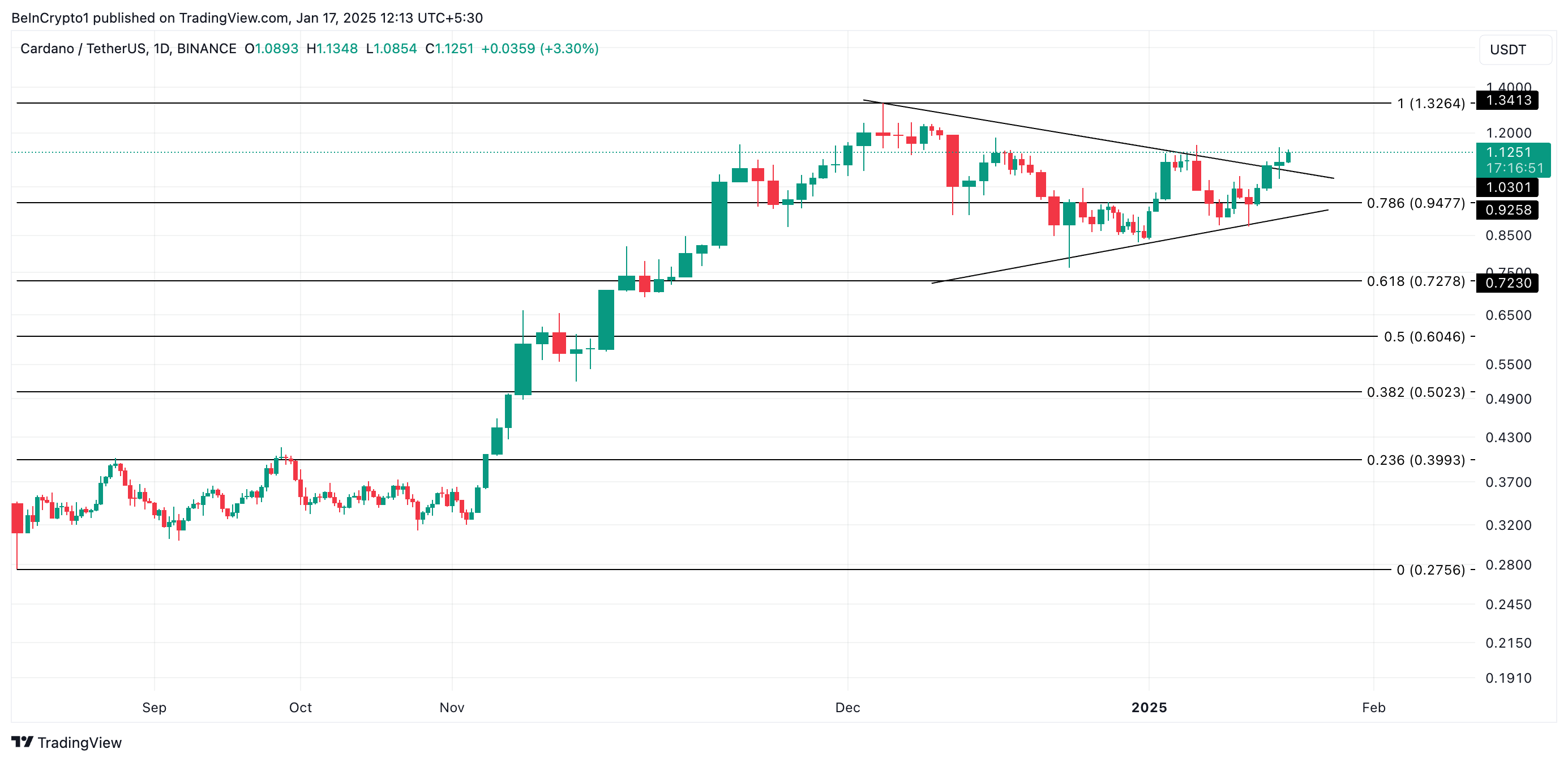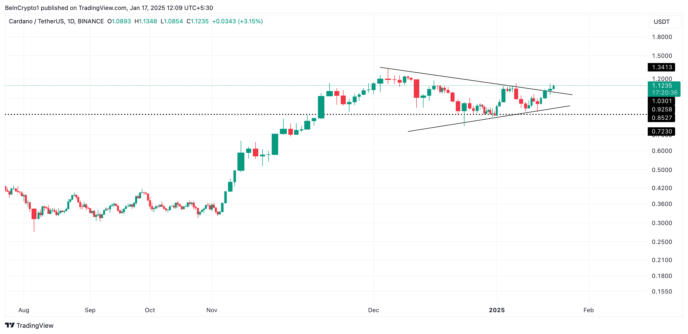 Dahil sa mas malawak na market consolidation, ang presyo ng ADA ay nag-trade sa loob ng isang symmetrical triangle mula Disyembre 3 hanggang Enero 15.