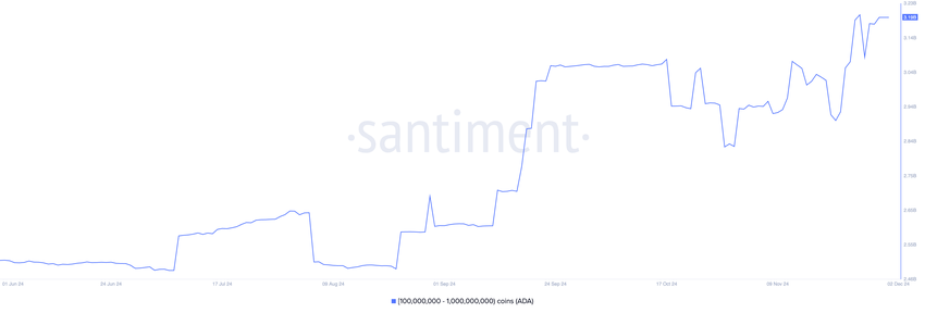 Sinabi rin na ang ADA whales o malalaking investors ay nagdagdag ng kanilang holdings sa panahong ito. Ayon sa on-chain data, ang mga ADA addresses na may hawak na 100 million hanggang 1 billion coins ay sama-samang nakabili ng $276 million na halaga ng ADA sa nakaraang pitong araw.