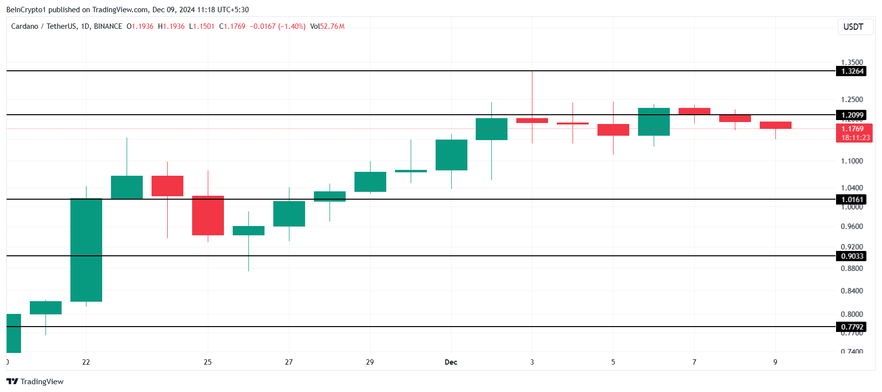 Kung hindi mag-materialize ang bullish momentum, may panganib na bumagsak ang ADA sa $1.01, isang critical support level. Ang pag-bounce mula sa puntong ito ay maaaring magdulot ng consolidation, na magpapanatili sa altcoin sa range-bound. Ang matagal na consolidation ay maaaring magpabagal sa anumang significant na pag-recover ng presyo, na nagdadagdag sa uncertainty ng mga investor.