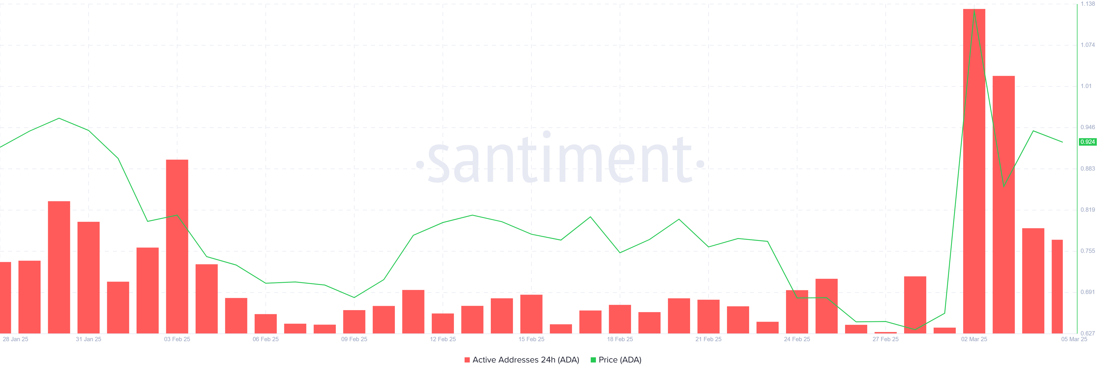 Sa kasalukuyan, ang Cardano ay nagte-trade sa $0.92, na nagpapakita ng 8% na pagtaas sa nakalipas na 24 oras matapos makaranas ng 24% na pagbaba noong Lunes. Gayunpaman, nananatili itong nasa ilalim ng mahalagang barrier na $0.99, na nagsilbing makabuluhang resistance level.