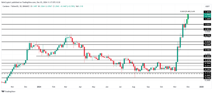 Kung mahawakan ng Cardano ang $1.30 bilang support, ang susunod na target ay maaaring $1.50. Ang pag-angat sa level na ito ay magpapalakas pa sa bullish outlook, na magpapatunay na may lakas ang kasalukuyang rally. Ang ganitong senaryo ay mag-i-invalidate sa bearish thesis at mag-signal ng patuloy na paglago, na ginagawang $1.50 ang susunod na major resistance level.