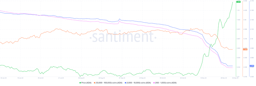 Ang mga mas maliliit na holders ng ADA ay aktibong nagbebenta nitong mga nakaraang linggo. Ayon sa data, ang mga wallets na may hawak na 100 hanggang 10,000 ADA ay nagbenta ng mahigit 72 million ADA na nagkakahalaga ng higit $92 million. Ang trend na ito ng pagbebenta ay nagpapatuloy na mahigit isang buwan, na nagpapakita ng patuloy na pag-take profit ng mga retail investors.
