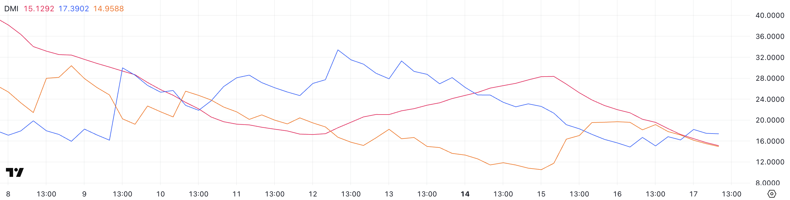 Kasabay nito, ang +DI (bullish directional indicator) ay bumagsak mula 22.61 hanggang 17.39, na nagpapakita ng humihinang buying pressure. Samantala, ang -DI (bearish indicator) ay tumaas mula 10.5 hanggang 14.95, na nagpapahiwatig ng unti-unting pagtaas sa selling strength.