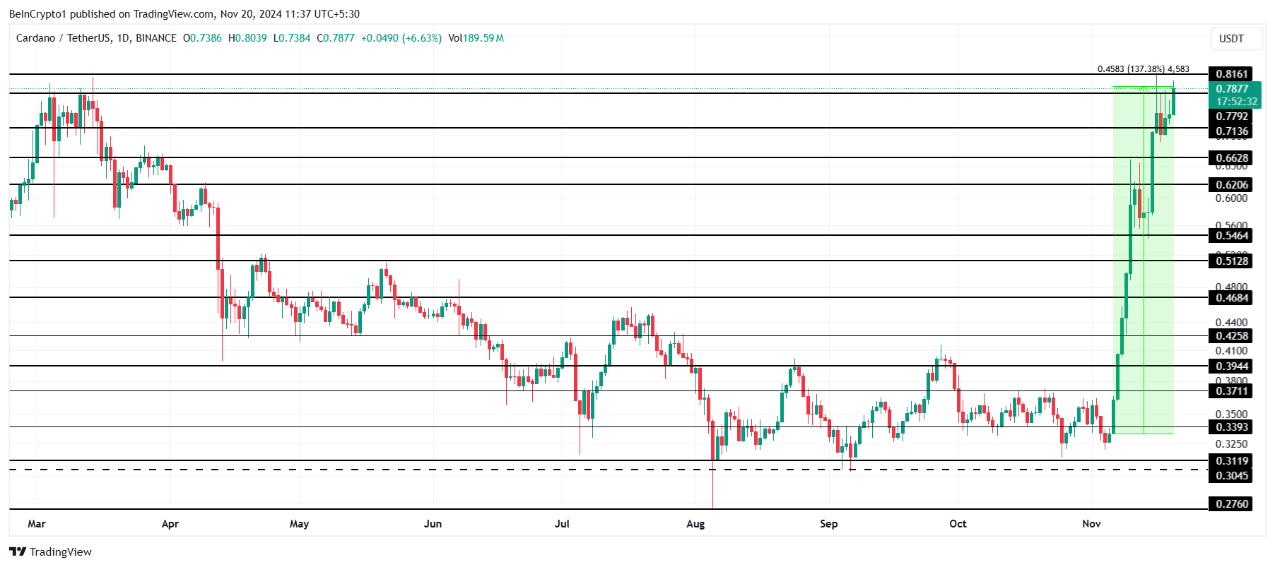 Nagtetrade ang Cardano ngayon malapit sa $0.80, bahagyang mas mababa sa critical resistance level na $0.81. Sa nakaraang dalawang linggo, tumaas ng 137% ang altcoin, naibalik ang mga price levels na hindi nakita mula pa noong Marso. Pero, ang pag-abot sa $0.81 ay nananatiling hamon dahil sa mixed market signals.