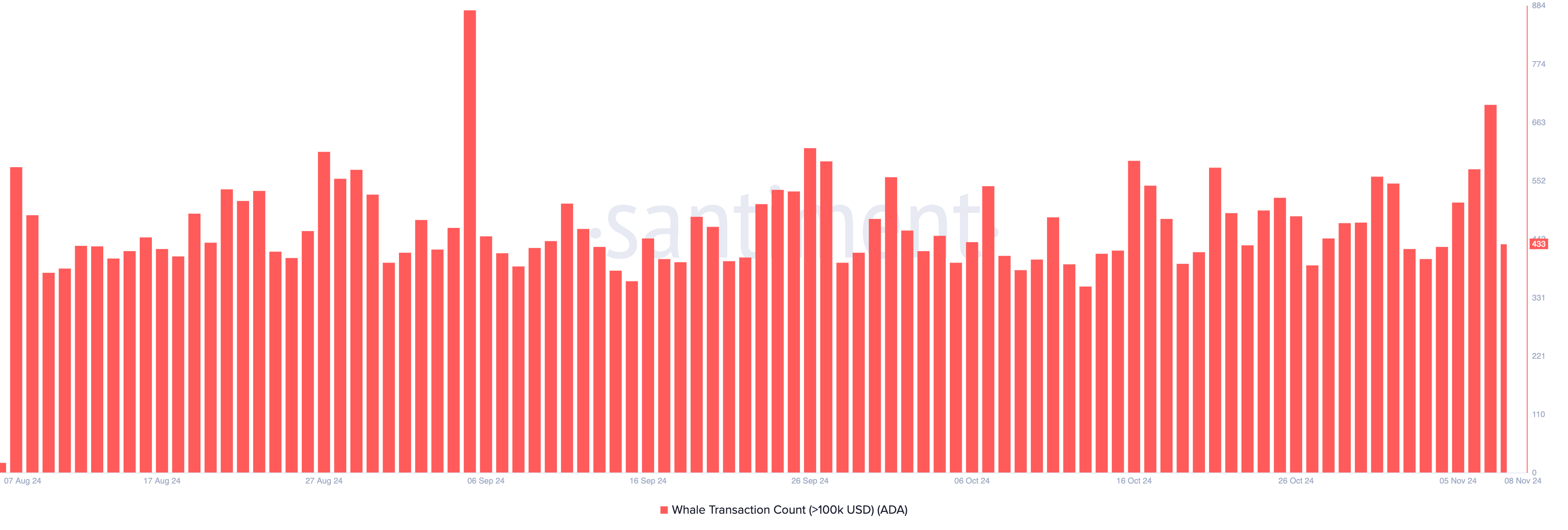 Ang pagtaas ng whale activity — malalaking transactions ng mga entities na may hawak na malalaking halaga ng asset — ay madalas na senyales ng tumataas na interes ng mga key market players. Ang mga malalaking transactions na ito ay nagpapakita ng lumalaking confidence mula sa mga malalaking investors, na baka bumibili sila in anticipation ng posibleng pagtaas ng presyo dahil sa broader market trends, tulad ng sa kaso ng Cardano.