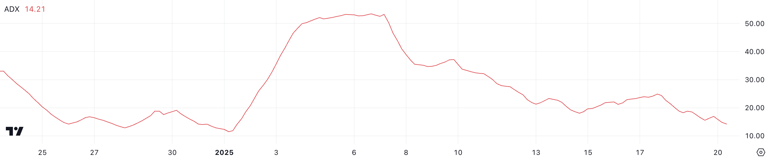 Ang ADX (Average Directional Index) ng Cardano ay nasa 14.2 ngayon, isang matinding pagbaba mula sa 24.8 tatlong araw na ang nakalipas nang magsimulang humina ang recent surge at uptrend nito. Ang pagbaba na ito ay kasunod ng mabilis na pagtaas ng presyo mula $0.89 hanggang $1.13 sa loob ng apat na araw, na nagpapakita ng shift mula sa malakas na pataas na momentum patungo sa mas hindi tiyak na phase.