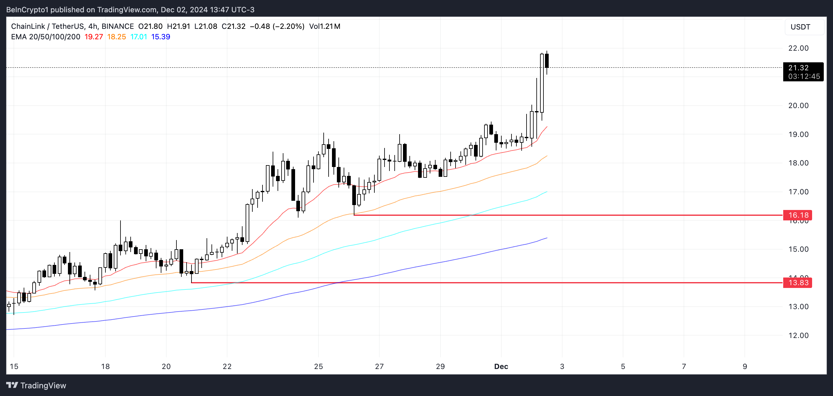 Sa senaryong ito, ang LINK price ay maaaring subukan ang initial support sa $16.18, na may posibilidad na bumaba pa sa $13.8 kung hindi mag-hold ang support level na ito.