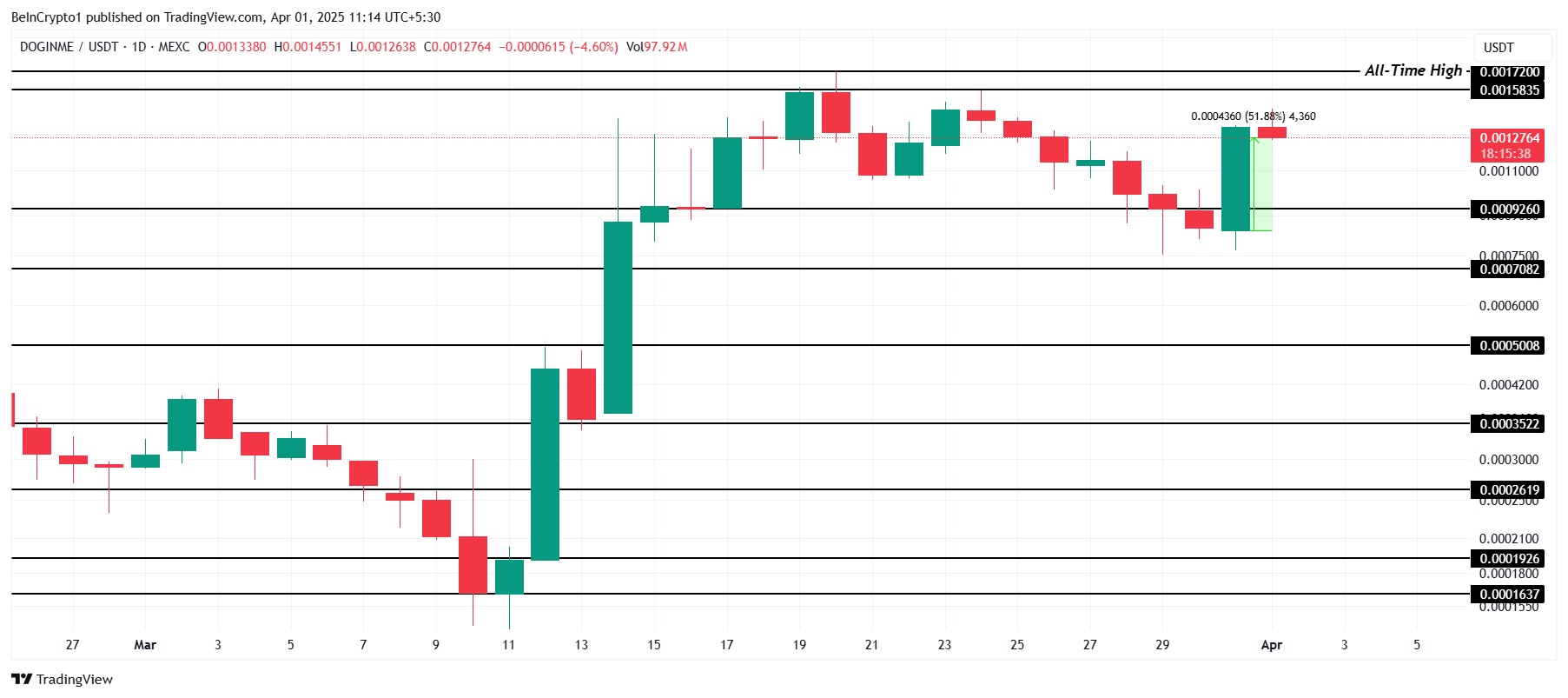 Matapos ang anunsyo ng Coinbase, nag-post ang Doginme (DOGINME) ng kahanga-hangang 60% rally sa loob ng araw. Bahagyang nabawasan ang pagtaas na ito, pero ang altcoin ay nagawang magsara na may 51% na pagtaas sa loob ng 24 oras. Nagte-trade sa $0.00127, ang DOGINME ay kasalukuyang tinetest ang resistance sa $0.00158, na naging mahalagang level para sa coin.