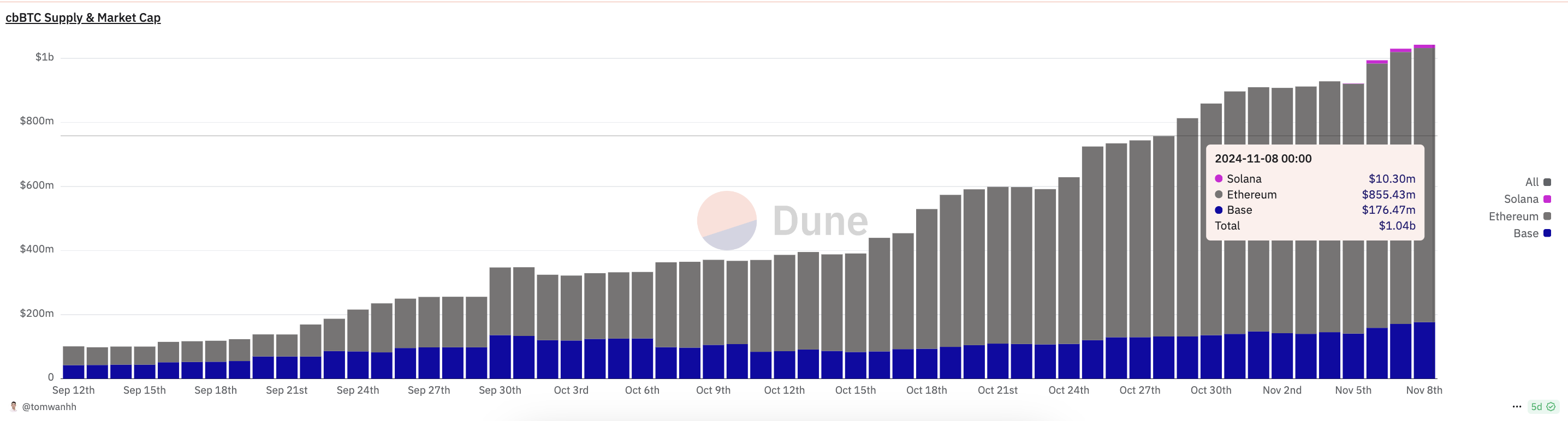 Ayon sa data sa Dune, yung Bitcoin wrapper na cbBTC may market capitalization na $1.04 billion as of this writing. Karamihan ng value nito, nasa Ethereum, na may $855.43 million, sunod yung Base Layer-2 blockchain at panghuli, Solana.