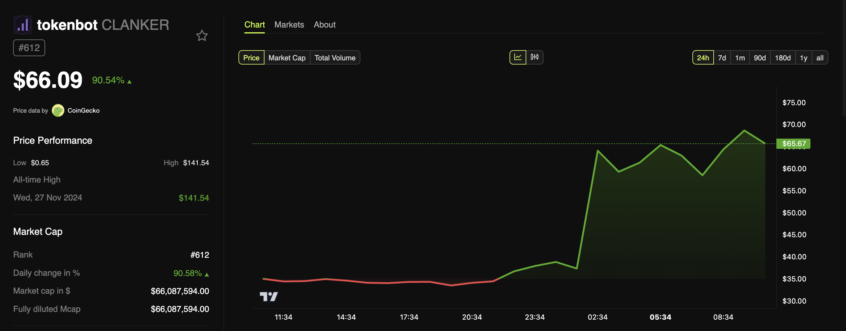Samantala, na may halaga na nasa $35 million bago ang balita, ang market capitalization ng CLANKER ay umakyat sa $66 million kasunod ng anunsyo ng Coinbase. Sa katunayan, ang token ay naging top gainer sa mga artificial intelligence (AI) coins, na nagrehistro ng kahanga-hangang 90% pagtaas sa nakaraang 24 oras. Sa kasalukuyan, ang CLANKER ay nagte-trade sa $66.