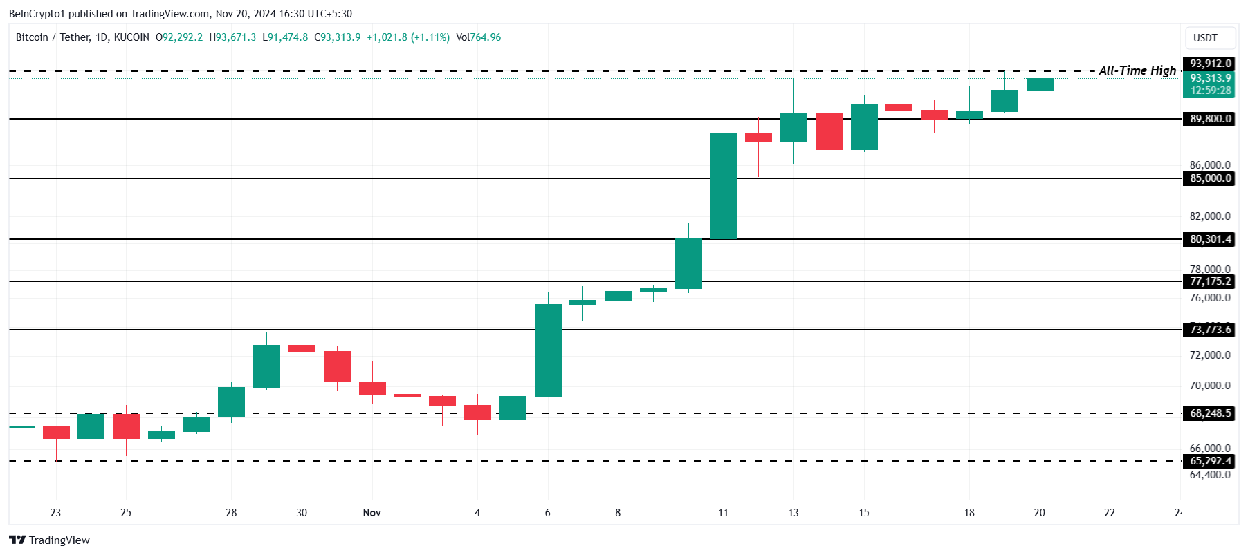 Nagte-trade ngayon ang Bitcoin sa $93,313, bahagyang mas mababa sa kamakailang all-time high nito na $93,912. Nalampasan ng bagong ATH na ito ang dating record na naitala noong nakaraang linggo, muling pinasigla ang interes ng mga investor at nagpapakita ng tibay sa patuloy na rally. Ang bahagyang pagbaba pagkatapos ay nagpapakita ng dynamic na price action ng Bitcoin sa gitna ng masiglang market activity.
