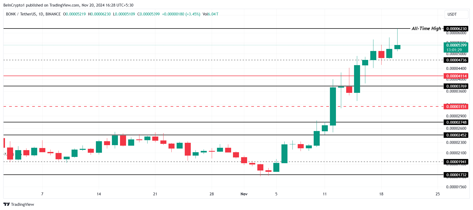 Umabot ang BONK sa all-time high na $0.00006230, na nagmarka ng ikalimang ATH nito sa loob ng pitong araw. Pero, bahagyang nag-correct ang meme coin, bumaba sa $0.00005339. Ang price action na ito ay nagpapakita ng mataas na volatility at malakas na interes ng market, na pinapagana ng mga investor na tumataya sa tumataas na kasikatan ng meme coins.