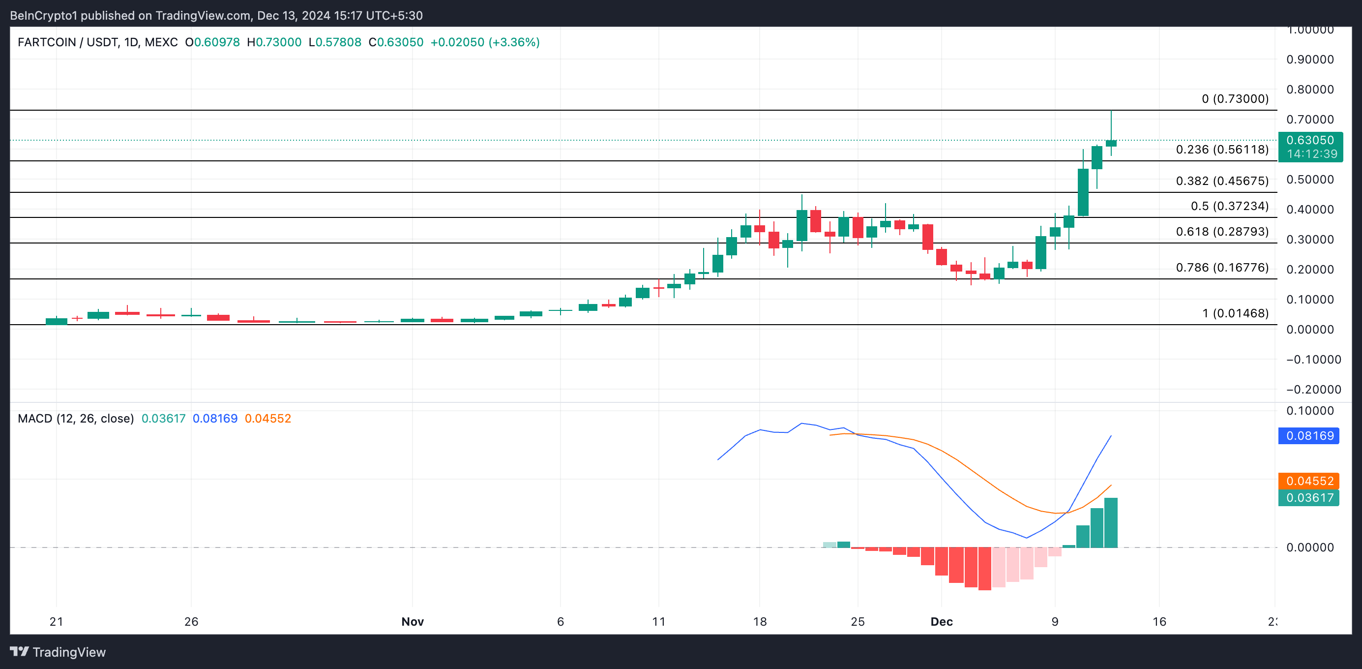 Ang all-time high ngayong araw ay ang pang-anim sa pitong araw, na nagpapakita ng tuloy-tuloy na pagtaas ng demand para sa altcoin, na kadalasang pinapagana ng meme coin mania. Ang setup ng FARTCOIN’s Moving Average Convergence Divergence (MACD) ay nagkukumpirma ng bullish outlook na ito.