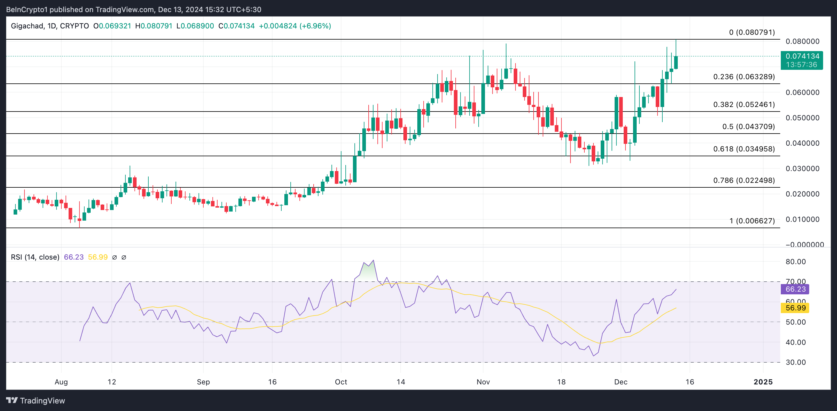 Gayunpaman, patuloy ang token accumulation sa mga market participant, na makikita sa pagtaas ng Relative Strength Index (RSI) ng GIGA. Sa oras ng pagsulat, ito ay nasa 66.23.