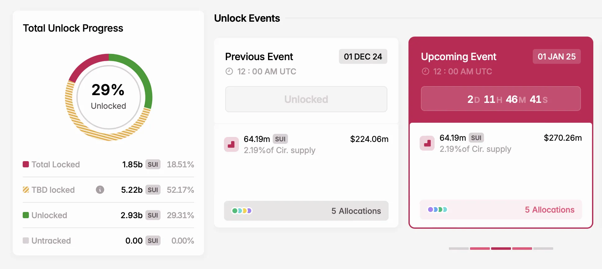 Ang popular na layer-1 blockchain Sui network ay naghahanda para sa malaking token unlock ngayong linggo. Sa Enero 1, ang protocol ay mag-u-unlock ng 64 million SUI tokens, kasunod ng kasalukuyang circulating supply na 2.92 billion. Kahit na matapos ang malaking release na ito, mananatiling hindi pa rin umiikot ang karamihan sa mga token.