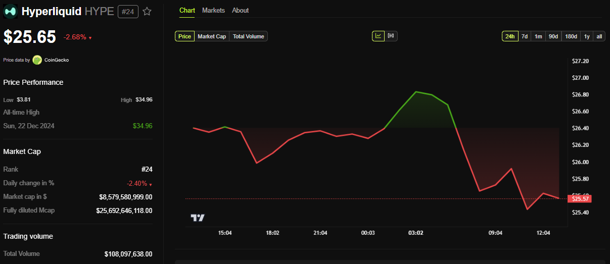 Kahit na may balitang ito, bumaba ng halos 3% ang HYPE token ng Hyperliquid mula nang magbukas ang session noong Lunes. Ayon sa data ng BeInCrypto, ang HYPE ay nagte-trade sa halagang $25.65 sa kasalukuyan.