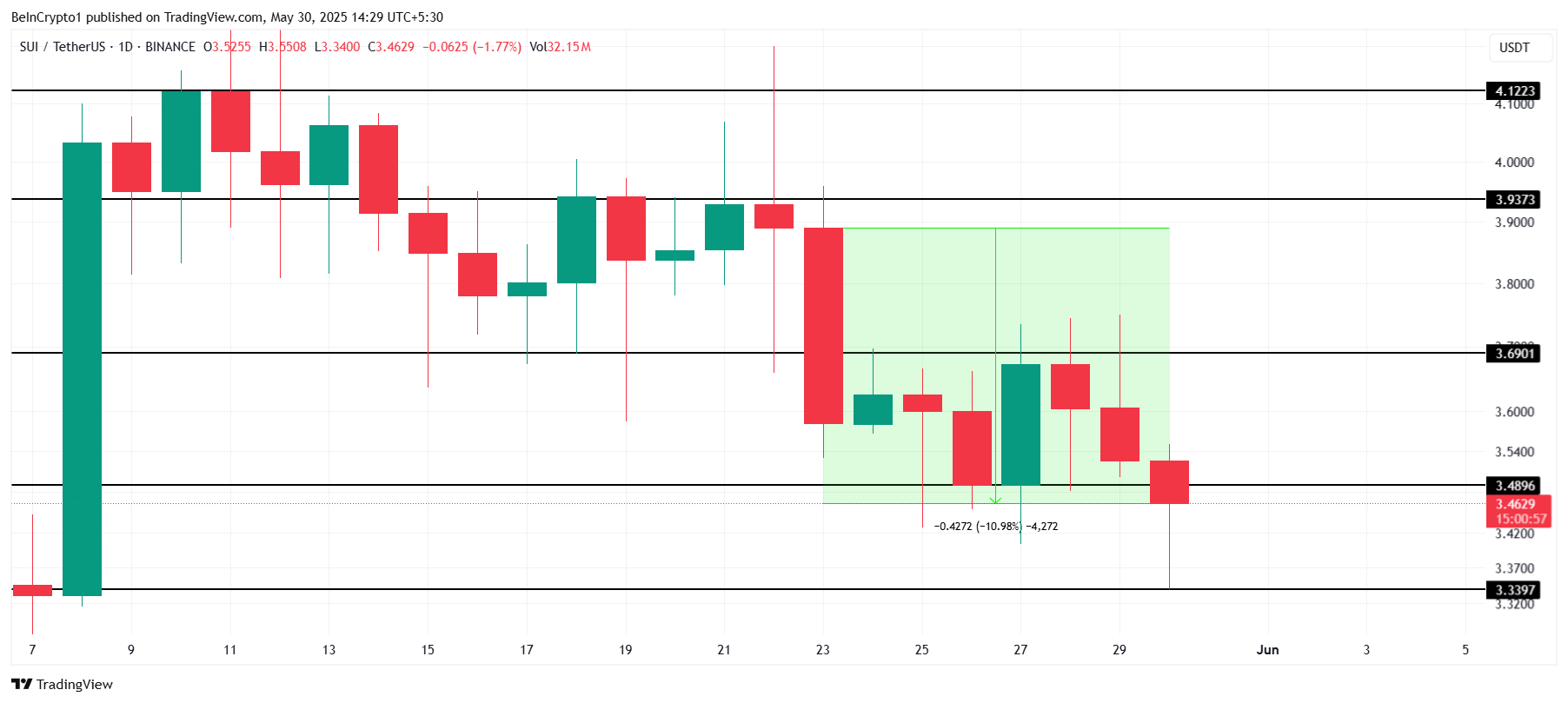 Bumagsak ang SUI ng halos 11% sa nakaraang 24 oras, at ngayon ay nasa $3.46. Ang pagbaba ng altcoin na ito ay sumusunod sa mas malawak na market trends pero baka lumala pa ngayong weekend dahil sa mga internal na factors na specific sa SUI.