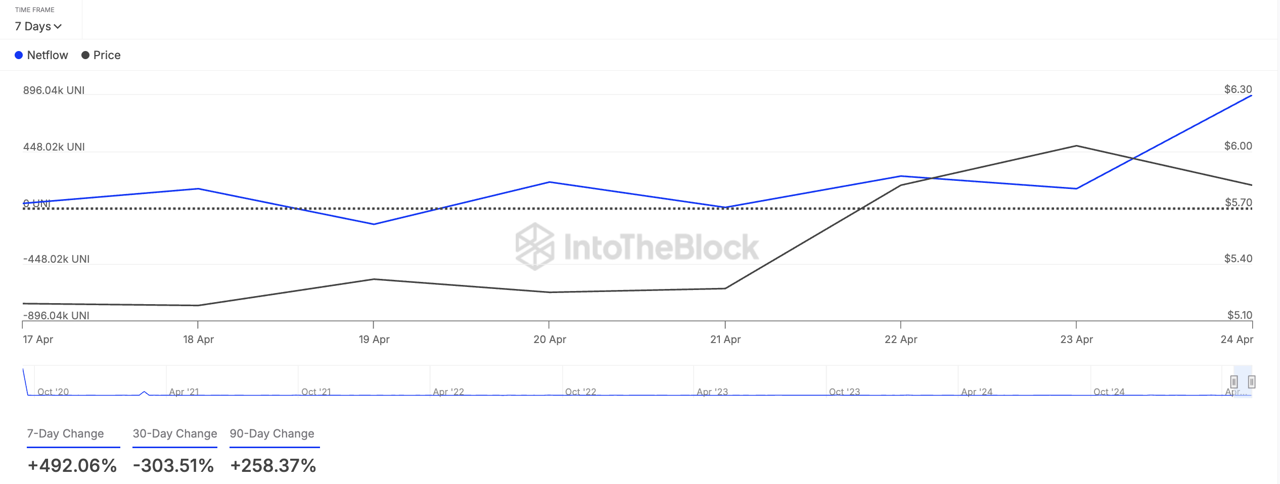 Isa sa mga token na binili ng crypto whales ngayong linggo ay ang governance token ng Uniswap na UNI. Makikita ito sa malaking pagtaas ng netflow ng mga malalaking holder nito, umakyat ng 492% sa nakaraang pitong araw.