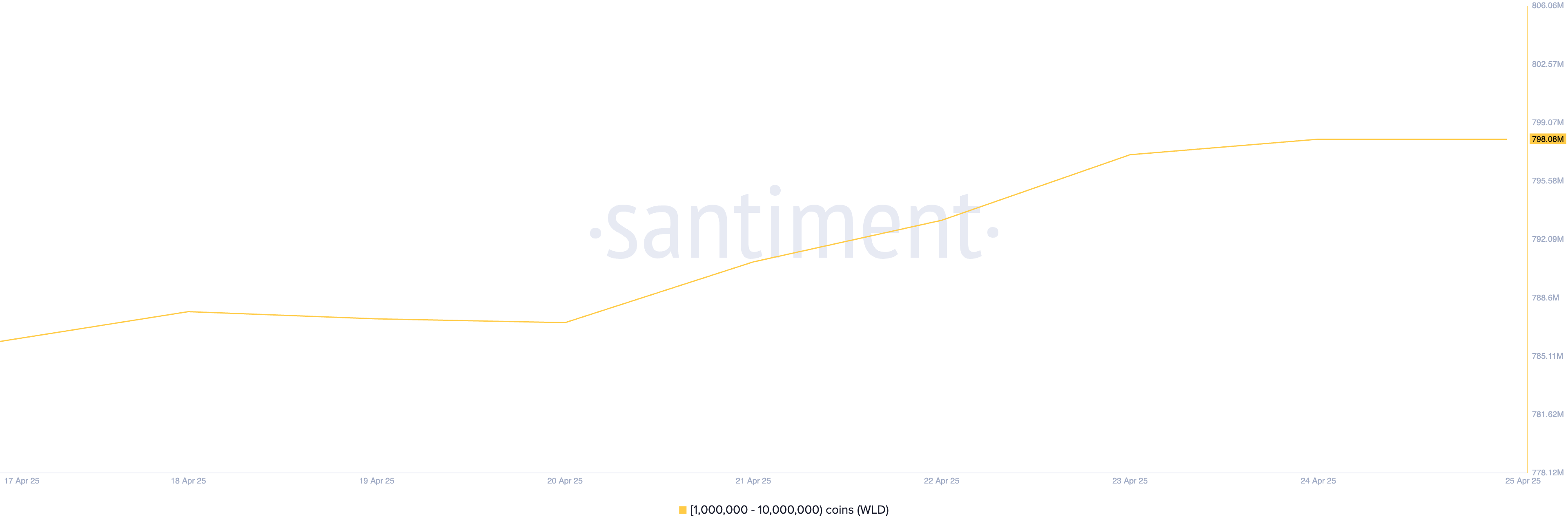 Ang grupong ito ng WLD investors ay may hawak na 798.06 milyong tokens sa kasalukuyan, na siyang pinakamataas na naitala nilang balance. Kung tataas pa ang accumulation ng WLD whales, pwedeng umakyat ang presyo nito pabalik sa higit $1.
