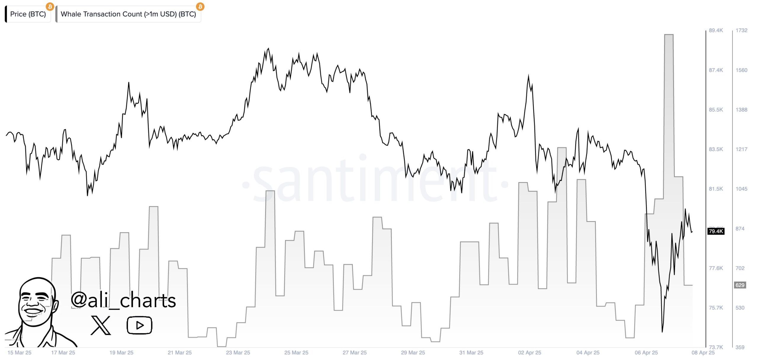 Kapansin-pansin, ayon sa analyst na si Ali, habang nag-rebound ang Bitcoin mula $74,500 hanggang $81,200, may 1,715 transaksyon na higit sa $1 million ang naitala on-chain. Ang mga metrics na ito ay nagpapakita ng kumpiyansa mula sa “smart money” na posibleng may market reversal.
