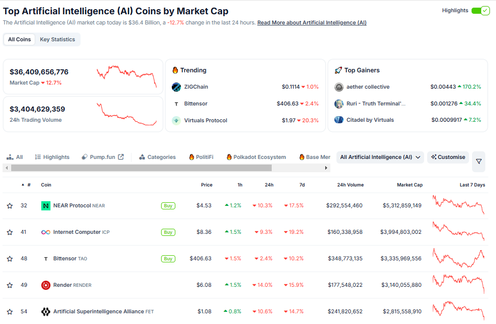 Kapansin-pansin na ang AI crypto segment ay naapektuhan din pagkatapos ng pag-angat ng DeepSeek. Ayon sa data mula sa CoinGecko, ang market capitalization ng AI crypto tokens ay bumaba ng halos 13% sa $36.4 bilyon.