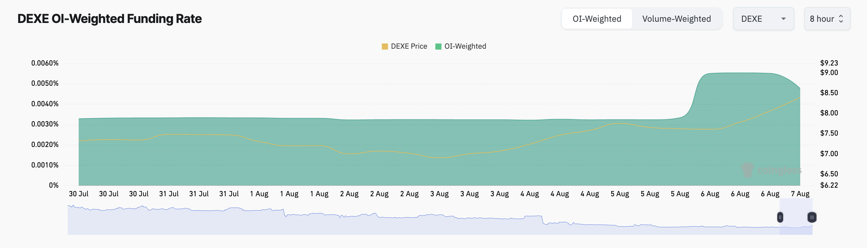 Dagdag pa rito, sa derivatives market, nanatiling positibo ang funding rate ng DEXE mula pa noong July 20, na nagpapakita ng lumalaking kumpiyansa sa mga futures trader. Sa kasalukuyan, ito ay nasa 0.0048%.