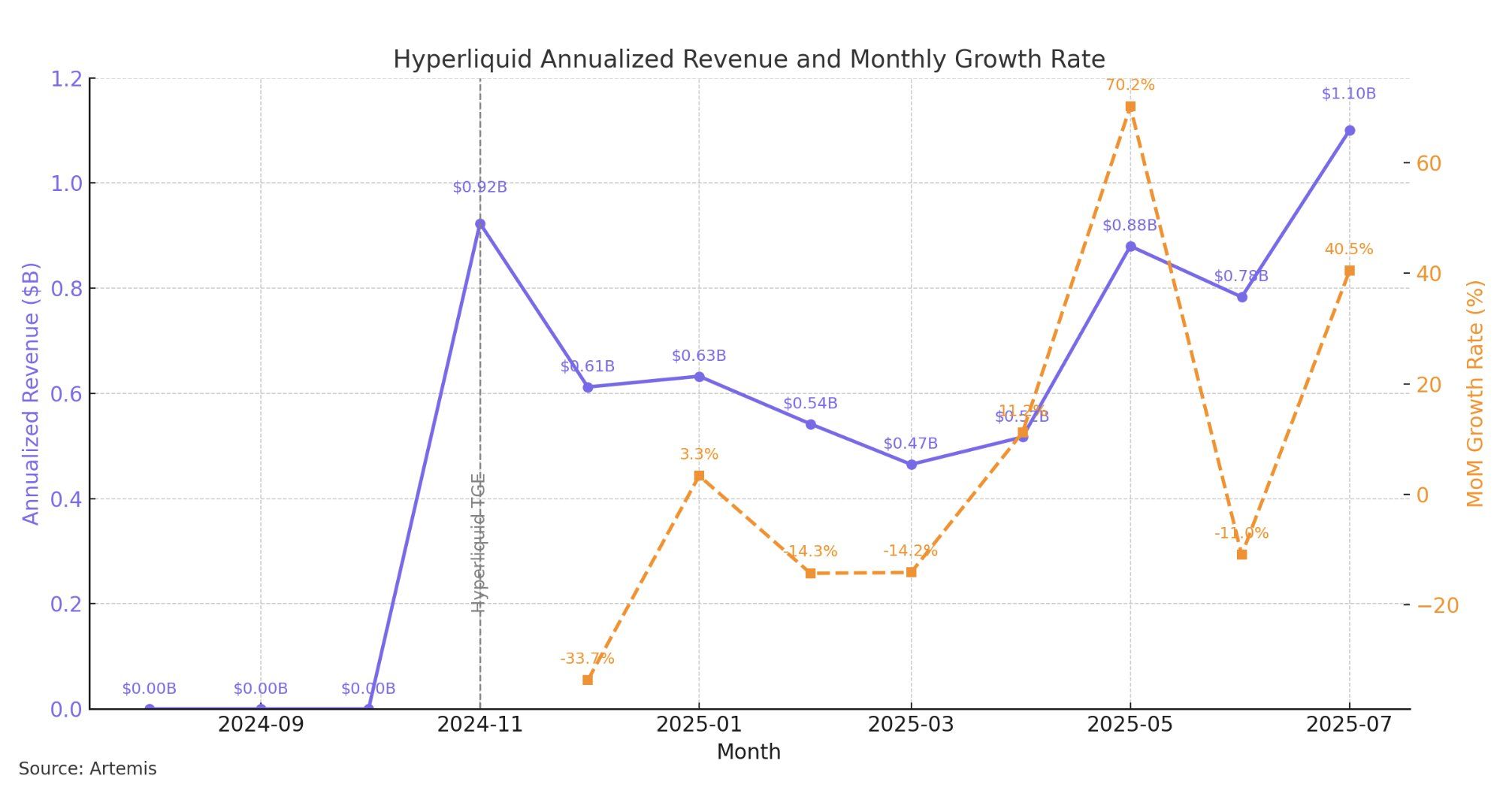 Shinare ni Jon Ma sa X na ang 40% month-on-month growth ng Hyperliquid ay nagdala sa annualized revenue nito sa $1.1 billion. Ipinapakita nito ang kahanga-hangang performance ng batang DeFi platform.