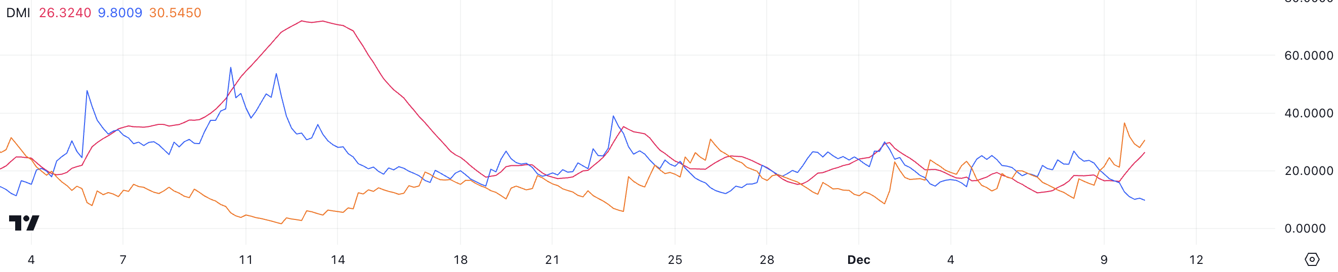 Ang ADX para sa DOGE ay kasalukuyang nasa 26.3, tumaas mula sa nasa 17 dalawang araw lang ang nakalipas, na nagpapahiwatig na lumalakas ang downtrend. Ang ADX value na higit sa 25 ay karaniwang nagpapahiwatig ng malakas na trend, at sa kasong ito, ang pagtaas ng ADX ay nagsasaad na ang bearish momentum ng DOGE ay lumalakas.