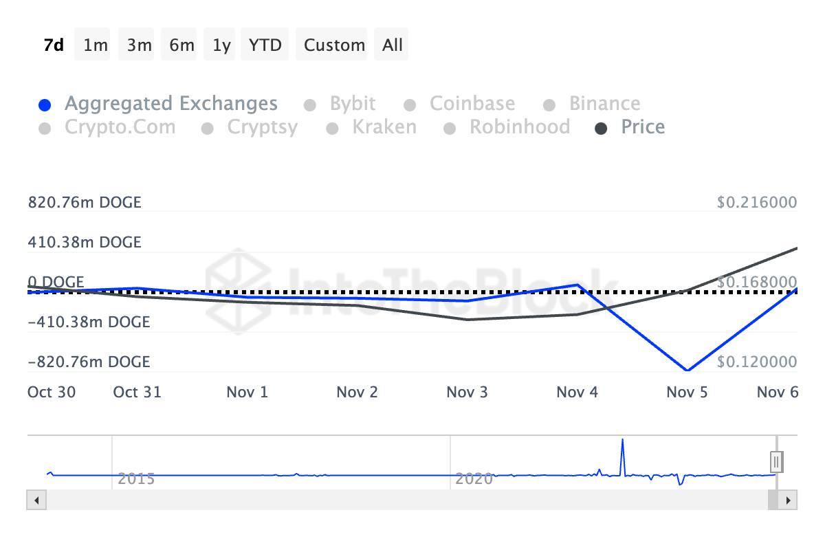 Bukod dito, ang on-chain data ay nagpakita ng pagtaas sa netflows ng palitan ng Dogecoin, na kinukumpirma na ang mga negosyante ay kumukuha ng kanilang mga kita. Ayon sa data ng IntotheBlock, ang netflow ng palitan ng barya — na sumusukat sa pagkakaiba sa pagitan ng mga deposito at pag-withdraw — ay umabot sa 852.46 milyong DOGE sa nakalipas na 24 oras.