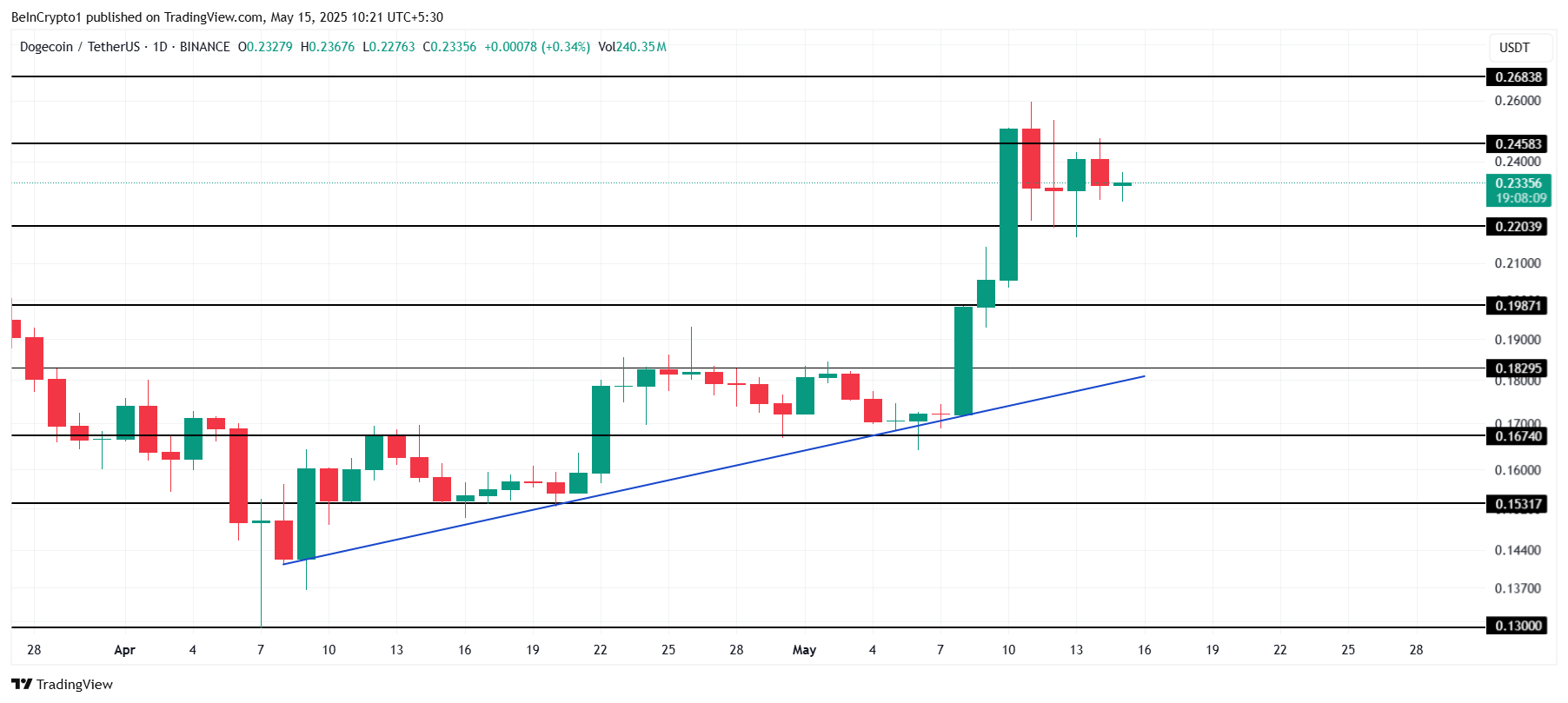 Ang Dogecoin ay nagte-trade sa $0.233 at papalapit na sa critical resistance level na $0.245. Kapag nalampasan ito, pwedeng umakyat ang presyo papunta sa $0.268. Ang pag-abot sa mga target na ito ay magrerepresenta ng malaking kita para sa meme coin at magpapatibay sa bullish momentum.