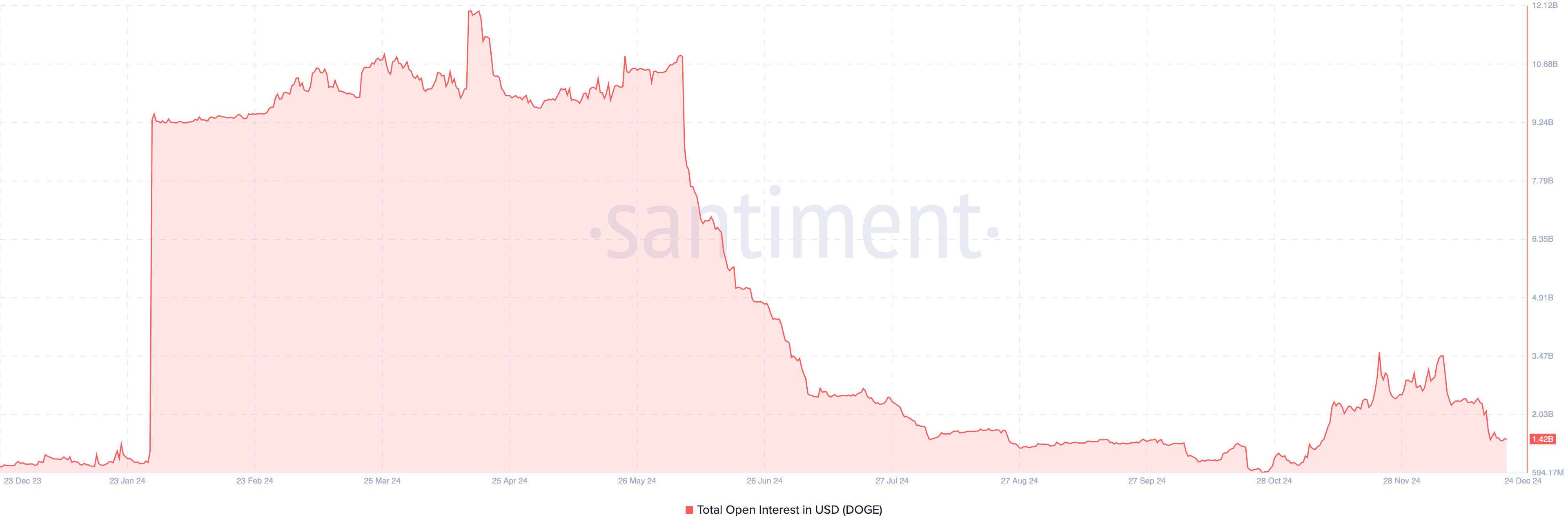 Sa ngayon, bumaba na sa $1.42 billion ang Dogecoin Open Interest. Ang OI ay kumakatawan sa kabuuang bilang ng mga open contract—long o short—sa futures o options market sa anumang oras. Ang pagtaas ng OI ay nagpapakita na may mga bagong posisyon na nadaragdag, na nagpapakita ng mas mataas na engagement at kumpiyansa sa galaw ng presyo ng cryptocurrency.