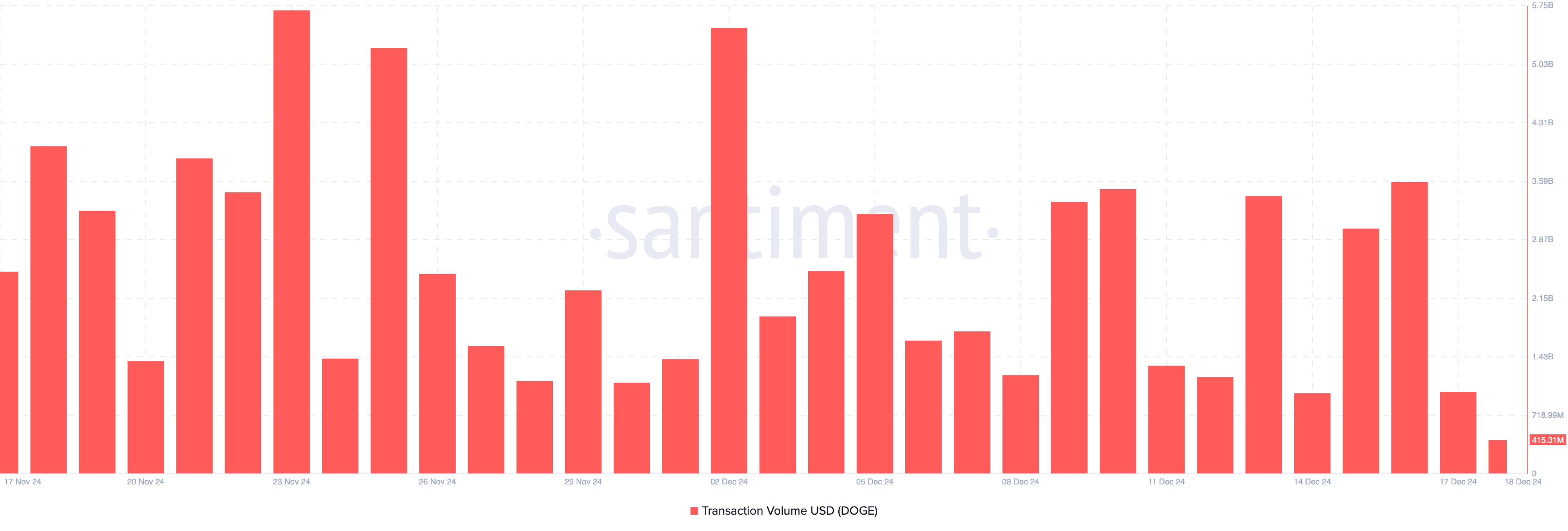 Ilang linggo matapos ang eleksyon ni Trump, umakyat ang transaction volume ng Dogecoin sa $5.69 billion, na nagpapakita ng malaking interes sa pag-trade ng cryptocurrency. Pero sa kasalukuyan, ayon sa Santiment data, bumagsak na ito sa $415.31 million.