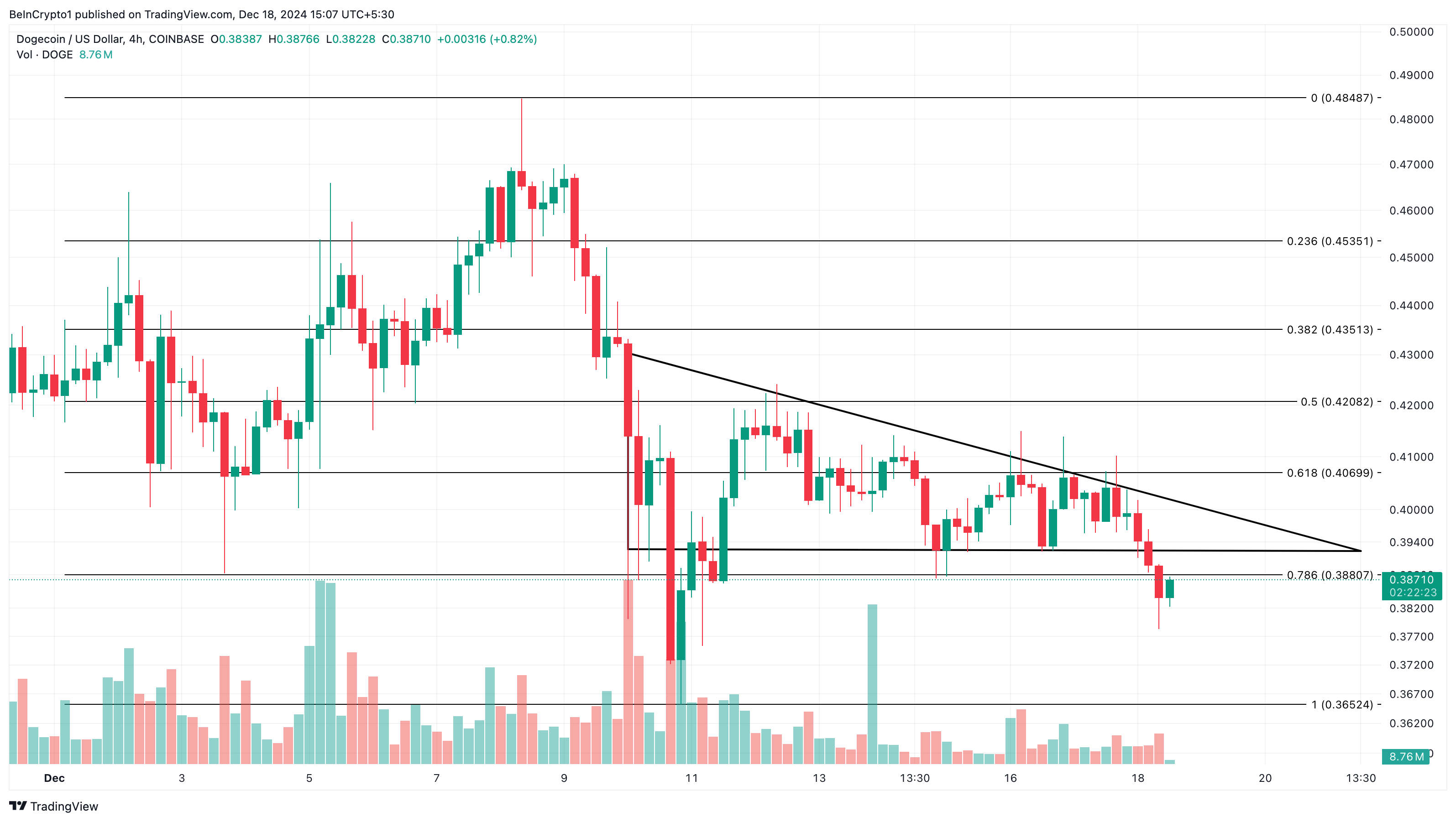 Sa 4-hour chart, patuloy na nagte-trade ang DOGE sa ilalim ng descending triangle. Ang descending triangle ay isang bearish chart pattern na may pababang upper trendline at mas patag na horizontal lower trendline.