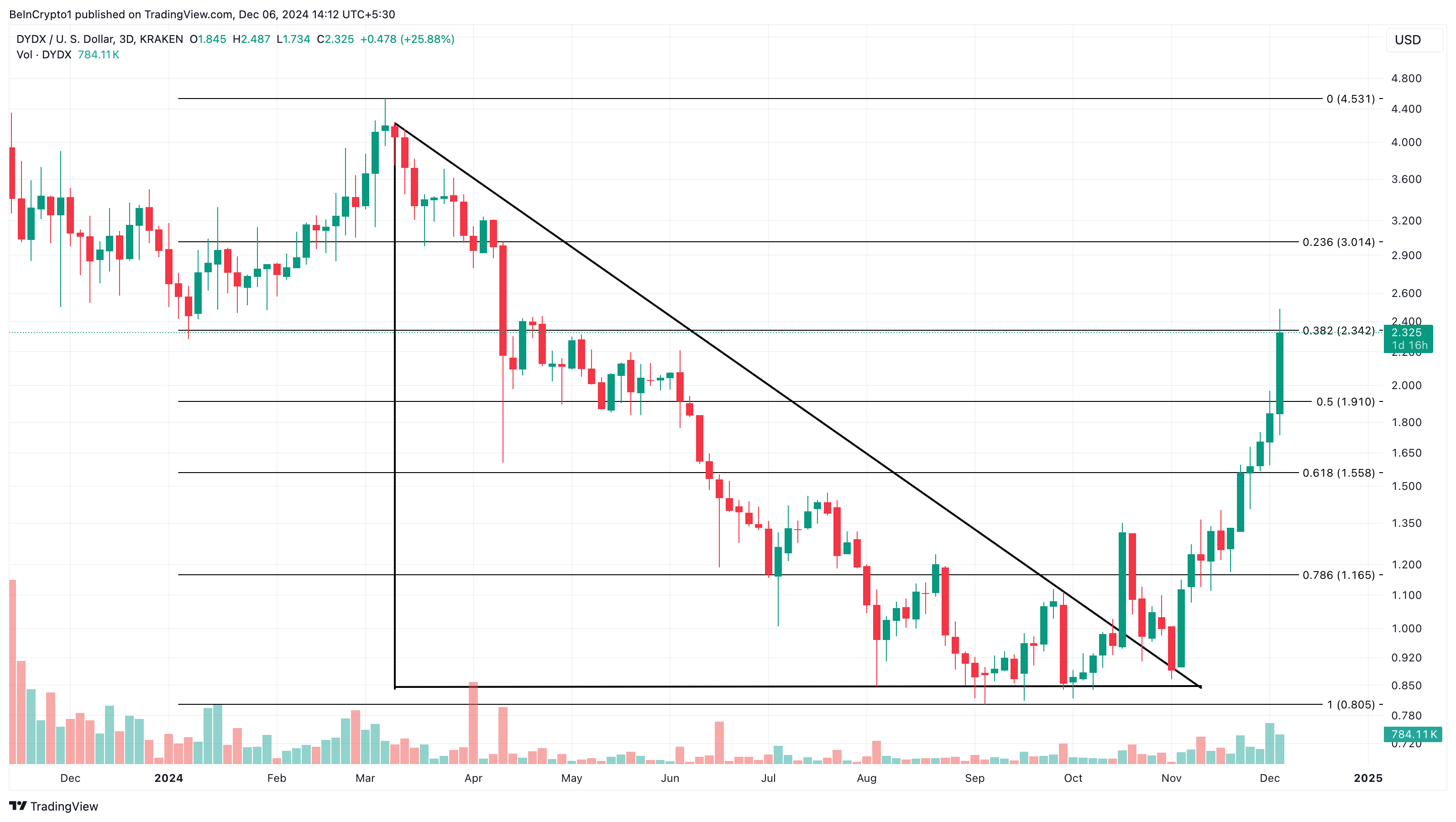 Ayon sa 3-day chart, ang posisyon ng DYDX bilang top-performing altcoin ay resulta ng pag-break out mula sa descending triangle.
