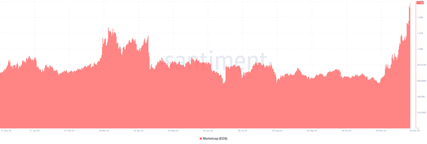 Ang EOS, ang native token ng open-source blockchain na EOS Network, ay tumaas ang market cap sa $1.74 billion, ang pinakamataas mula noong Nobyembre 2022. Ang milestone na ito ay kasunod ng 165% price surge sa nakaraang 30 araw, na ikinagulat ng maraming market observers.