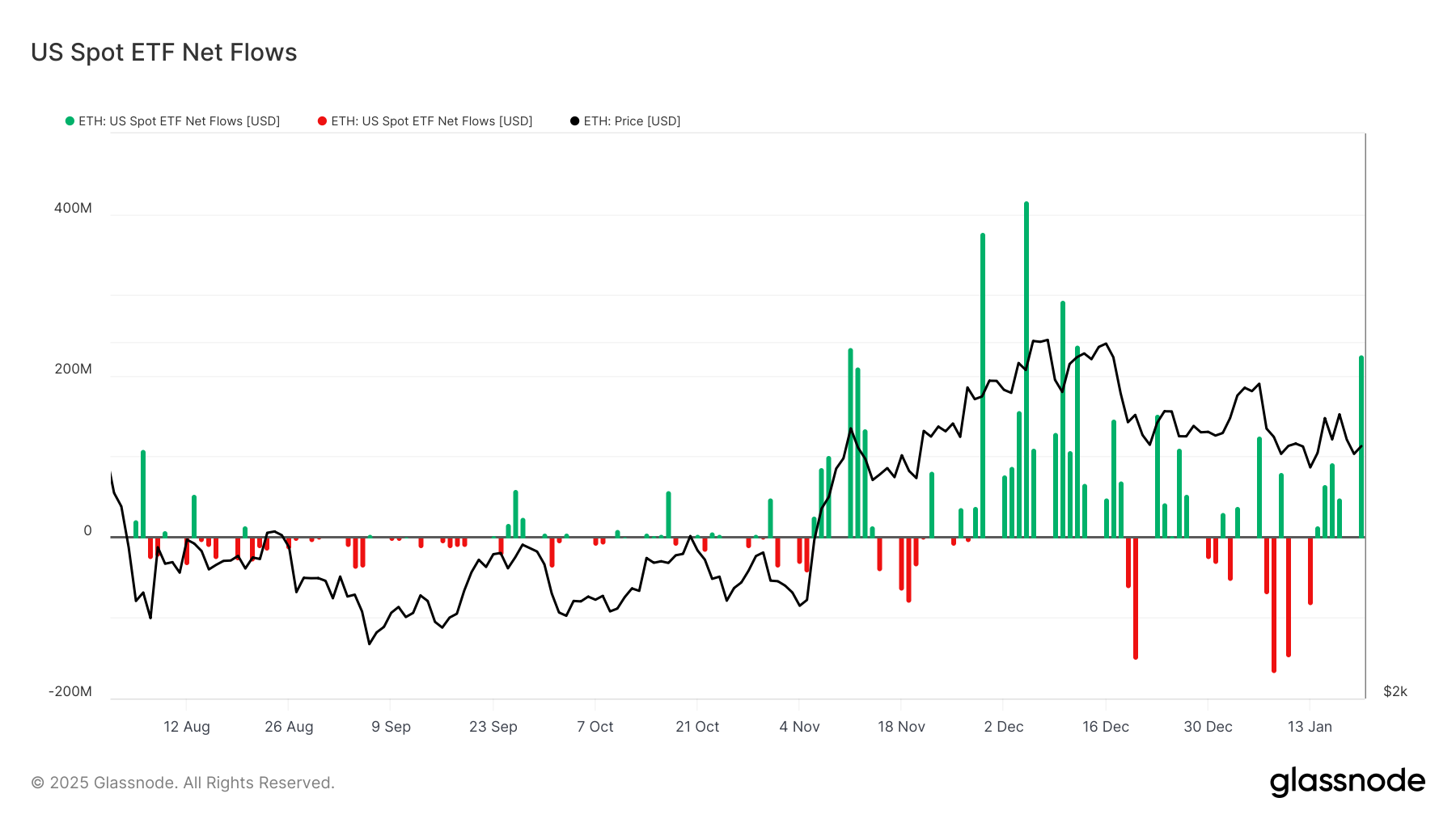 Ayon sa data mula sa Glassnode, umabot sa $227 million ang inflows sa US ETH spot ETFs noong Lunes. Ito ang pinakamataas na net inflows sa isang araw mula noong Disyembre 9. Ang pagtaas ng ETF inflows ay nangyari kasabay ng pag-upo ni pro-crypto Donald Trump bilang presidente ng US, na nagpalakas ng kumpiyansa sa kabuuang kondisyon ng market.