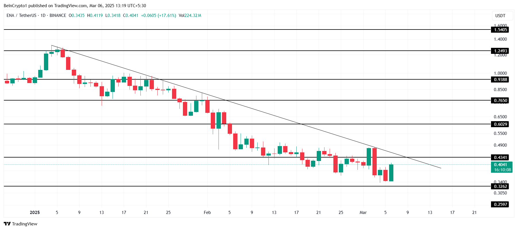 Sa kasalukuyan, ang presyo ng Ethena ay nasa $0.404, bahagyang mas mababa sa resistance level na $0.434. Kahit na may pagtaas ng 17%, hindi ito sapat para baligtarin ang mas malawak na downtrend. Para makawala ang ENA sa kasalukuyang market conditions, kailangan nitong lampasan ang $0.434 na hadlang at panatilihin ang mas mataas na levels nang may katiyakan.