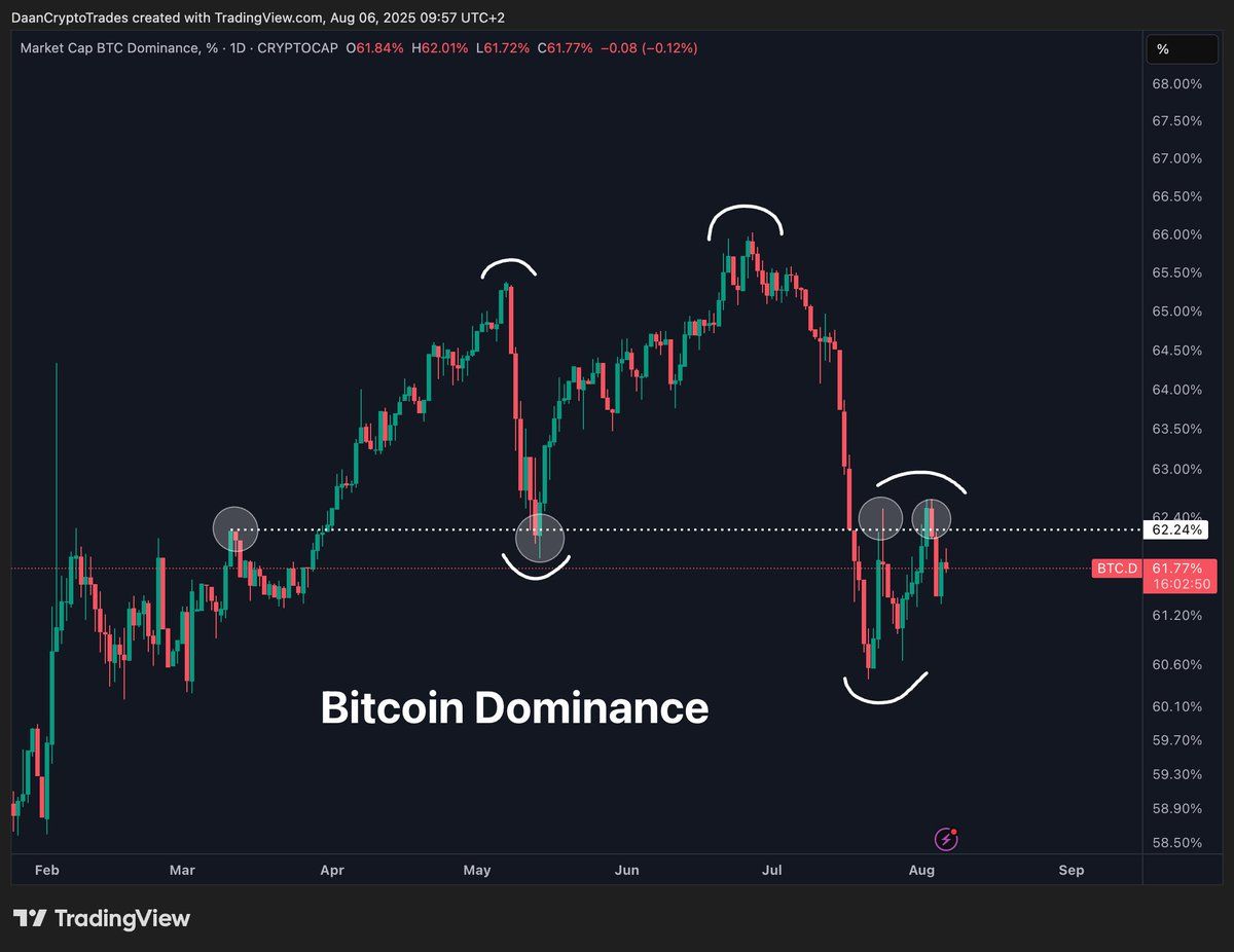Sa kabila nito, ang kasalukuyang 62% zone para sa BTC.D ay isang sensitibong threshold. Nagbabala si Analyst Daan na kung babasagin ng BTC.D ang level na ito, maaaring bumalik ang market pabor sa Bitcoin. Sa ganitong sitwasyon, maaaring magpatuloy ang underperformance ng ETH kumpara sa BTC.